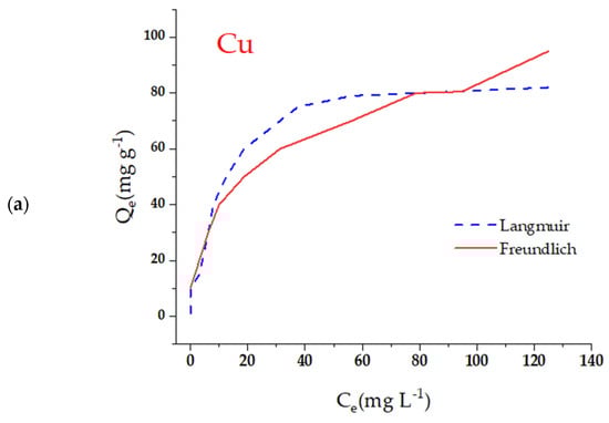 Adsorption isotherms of the metal ions evaluated under the experimental conditions: (a) Cu; (b) Pb; (c) Cd. Note: initial concentration (C0) of 20–200 mg/L−1, adsorbent dose of 1 g/L−1, temperature of 25 °C, and contact time of 24 h.
