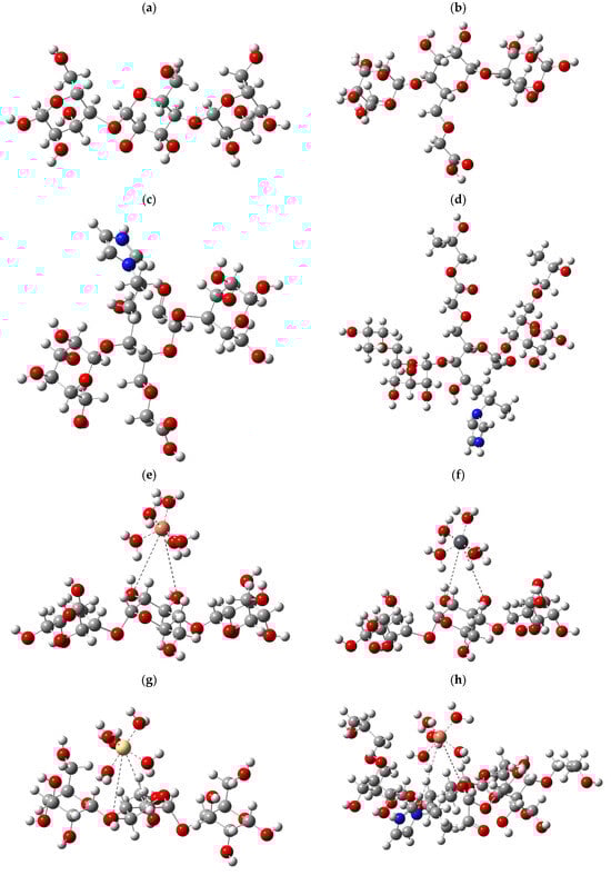 Structural models were designed to represent its behavior in aqueous media to evaluate the effectiveness of starch in removing heavy metals. The base structure of these models was built from three starch units, which were considered essential to capture the essence of their interaction with metals. To realistically simulate the aquatic environment, each metal analyzed was accompanied by five water molecules (H2O), giving rise to the configuration M-5H2O, where “M” refers to the metals Cu, Pb, and Cd. The adsorption phenomenon describes the interaction between starch and hydrated metals. Depending on the nature of the bond, the metal bond could displace one or two water molecules. In cases where a single bond was formed with starch, one water molecule was displaced, while if the metal established two bonds, the interaction was mediated through two water molecules. The different configurations obtained are presented in Figure 7.