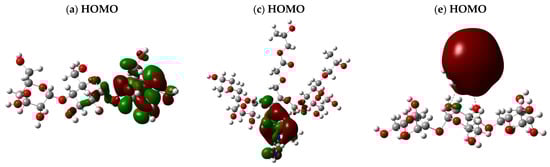 The HOMO-LUMO band-splitting energy and the total dipole moment (TDM) were calculated for the proposed starch and CMS-g-PVI/PVA structures in the presence of M-5H2O, where “M” corresponds to the metals Cu, Pb, and Cd. These calculations were performed using the same theoretical approach, allowing an accurate comparison of the electronic effects of the interaction with metals. Figure 8 illustrates the obtained HOMO-LUMO band splitting, highlighting the distribution of the orbitals within the molecule. The orbitals are uniformly distributed along the three structural units in the starch and CMS-g-PVI/PVA models without metals. However, when metals come into play, the electron density is predominantly concentrated around the metal atoms, evidencing an alteration in the electron distribution and, therefore, in the chemical properties of the system.