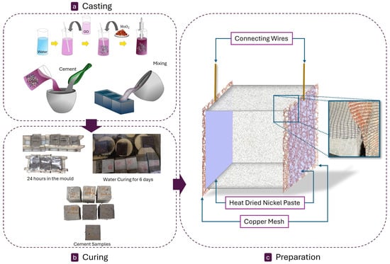 After 6 days of water curing (a total of 7 days), the samples were removed from the curing tank and dried on paper towels. The two opposite surfaces of specimen were then sanded with 80 and 240 grit aluminium oxide sandpaper to create a scabbled edge for mesh adhesion preparation. Copper mesh was cut to fit the size of the cement blocks, with an extra overhang for testing, and was adhered to the cement sample with high-performance nickel paste, which had a thermal conductivity of 2.6 W/mK. Nickel paste was then exposed to a heat gun for 2 min on each side to solidify and improve adhesion. In the experiment, using an embedded mesh would have required extending the specimen in one direction to accommodate the mesh, then trimming and resizing to produce standard 50 mm cubic samples for compression testing. Hence, an externally applied copper mesh was selected as the preferred option to simplify the preparation process while ensuring compatibility with the testing stages.