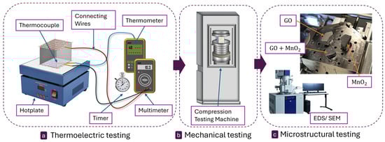 The surface morphology and elemental composition of the cement-based composites after 28 days of ageing were analysed using Hitachi SU7000, a scanning electron microscope (SEM) sourced from Tokyo, Japan equipped with AZtecOne electron dispersive spectroscopy (EDS) system sourced from Oxford instruments, High Wycombe, UK. Only the GO 0.075 wt.%, MnO2 7.5 wt.%, and GO 0.075 wt.% + MnO2 7.5 wt.% samples were used in these characterisations. The selection of these samples was based on the results of the Seebeck coefficient and compression testing results. These techniques allowed for the observation of the hydration characteristics of the three mixtures within their hydrated matrix. The observation surface of each specimen was polished to eliminate any irregularities that could interfere with the spectroscopy analysis. This was performed by sequentially polishing the surface with sandpaper grits of 120, 200, 400, 800, 1000, 1500, and 2000, followed by diamond 1 µm polishing paper with a compatible 1 µm lubricant. To prevent interference from surface charge accumulation during Scanning Electron Microscopy, each sample surface was then made conductive by applying a 5 nm carbon coating. Specimens prepared for the chemical characterisation are shown in Figure 2c.