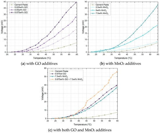 As shown in Figure 3a, increasing the GO content resulted in a higher voltage at all temperatures. The 0.075 wt.% GO sample generated the highest amount of voltage at 65 °C with a value of 40 mV. As shown in Figure 3b, increasing the MnO2 content also resulted in a higher voltage at all temperatures. The highest voltage of 37 mV was recorded with the 7.5 wt.% replacement of MnO2 with cement. The sample containing both materials (GO 0.075 wt.% and MnO2 7.5 wt.%) achieved the highest thermoelectric voltage of 56 mV at 65 °C, as shown in Figure 3c. More than 7.5 mV is considered to be a usable amount of voltage in IoT-related applications [45]. With GO, MnO2, and GO+MnO2 this was achieved at surface temperatures of 41 °C, 43 °C, and 38 °C, which are common in the surface of concrete that is exposed to the sun during a summer month.