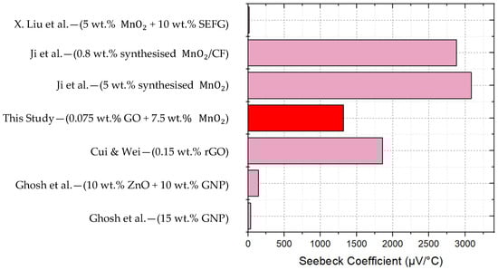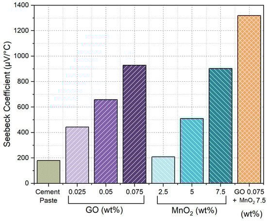 More recent studies have identified metal oxides as a cost-effective additive that significantly enhances the Seebeck coefficient of cement composites when used as conductive fillers. Fe2O3, Bi2O3, ZnO, and MnO2 are some of the transition metal oxides that have been added to cement to enhance its thermoelectric properties [21,22,23]. Recent research shows that MnO2 can be used as a supplementary material to achieve a high TE potential, even at lower concentrations [22,24]. In one study, synthesised MnO2 powder with a nanorod structure (diameter of approximately 50 nm, length of up to 1.4 μm) was replaced with cement at 5 wt.% and a Seebeck coefficient of 3085 μV/°C was achieved [25]. In another study by Ji et al. [22], a hybrid concrete composite incorporating MnO2 and carbon fibre (with a diameter of 8 μm and a length of 4–6 mm) was examined. This composite achieved a remarkable Seebeck coefficient of 2880 µV/°C−1 with just 0.8 wt.% of synthesised MnO2/carbon fibre relative to the cement content. This value was 100 times higher than that of pure carbon fibre-reinforced concrete, indicating that the substantial improvement was largely attributable to the inclusion of the metal oxide. However, in another study by a different researcher, MnO2 was combined with Surface Enhanced Flake Graphite (SEFG), and the results showed that at 75 °C, a composite containing 5 wt.% MnO2 (average diameter of 50 nm) and 10 wt.% SEFG (specific surface area of 27 m2/g and a size of 8 μm) achieved a Seebeck coefficient of only 16.74 μV/°C [24]. It is important to note that the above testing results were obtained using different mixtures and different preparation methods, which could all affect the measured properties.