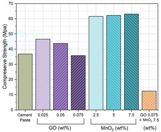 Furthermore, the development of compressive strength for GO and MnO2 may differ from that of standard cement paste, but this aspect was not investigated in the current study. Notably, MnO2 has been observed to provide high early strength compared to ordinary cement, suggesting that compressive strength testing should be conducted at different time intervals to capture these variations.