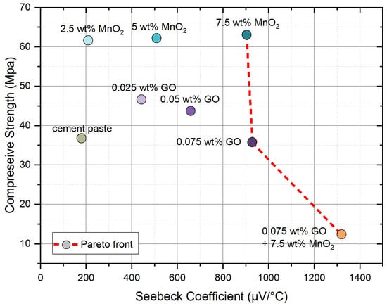 As discussed, the effect of GO and MnO2 on the workability of the mixture played a significant role in the compressive strength results. However, the workability comparison between mixtures is not quantitatively discussed in this paper, as only two main parameters (strength and Seebeck coefficient) are considered within the scope of this multi-objective analysis. It is acknowledged that maintaining the other parameters as closely as possible would lead to a better comparison; however, achieving identical workability is challenging with two distinct types of fillers and could result in differing w/c ratios, which are far more critical to keeping constant. Interested readers can refer to Torre et al. [37] for additional comparisons involving the addition of MnO2 and to Fonseka et al. [46] for comparisons involving the addition of GO.