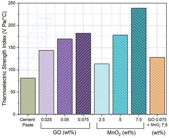 Figure of merit (ZT) and Power Factor (PF) are used to find new superior thermoelectric materials or to compare thermoelectric materials dimensionlessly. Similarly, in this paper, we introduce the Thermoelectric Strength Index (TSI) as given in Equation (1) for the evaluation of the material in terms of both thermoelectric and strength properties, considering equal weights. In this equation, is the compressive strength of the material, is the voltage difference, and is the temperature difference between the samples. Calculated TSI factors for all seven samples are shown in Figure 8, from which it is evident that the MnO2 7.5 wt.% composite is the best for thermoelectric modules in structural applications, offering both structural viability and efficiency.