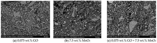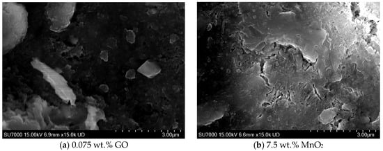 Since the surface of the specimen was polished to facilitate accurate elemental analysis using EDS, qualitative information on the undisturbed crystallography and surface topography of microphases on the specimen surface were observed by scanning larger air void areas using secondary electron imaging (Figure 11). The morphology of the hydrated region in the 0.075 wt.% GO and 7.5 wt.% MnO2 specimens is shown in Figure 11a,b. The hydrated matrix in the 7.5 wt.% MnO2 specimen formed a densely packed calcium silicate hydrate structure compared to the hydrated region in the 0.075 wt.% GO specimen, which exhibited comparatively higher nano-porosity.