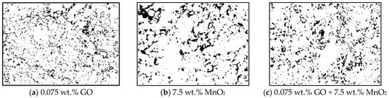 The backscattered electron (BSE) imaging results, as depicted in Figure 9, provide a visual representation of the specimens under investigation. Analysis revealed that the specimen containing 0.075 wt.% GO exhibited a lower degree of hydration and increased porosity in comparison to the sample with 7.5 wt.% MnO2 (Figure 9a,b). This was associated with the rapid water adsorption in the GO during the preparation phase, which reduced the free water availability for cement hydration and increased porosity during the casting process without any additional water-retarding admixtures. When analysing the microstructure of the 0.075 wt.% GO + 7.5 wt.% MnO2 specimen, a higher porosity and loose particles were visible on the surface (Figure 9c). During the polishing process for microstructural analysis, it was observed that the surface of the specimen exhibited significant particle loss. These increased porosities and loose particles further validated the low compressive strength observation in this sample. Micro-porosity was segmented using BSE imaging in conjunction with specifically developed MATLAB (R2021b) programmes, as demonstrated in Figure 10. From Figure 10b, microscale porosity is evident in the cement matrix containing 7.5 wt.% MnO2, whereas the matrix incorporating 0.075 wt.% GO exhibits comparatively reduced micro-porosity (Figure 10a). This is due to the GO nucleation site distribution throughout the matrix, and these sites reducing the formation of microscale capillary pores.