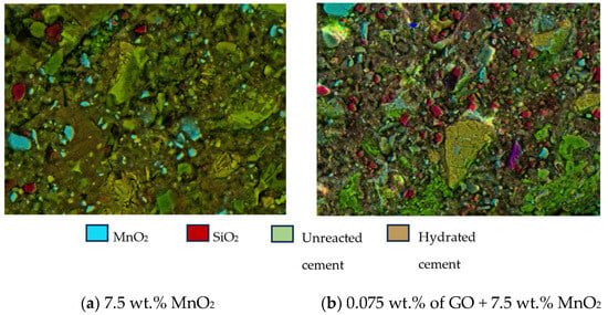 When observing the manganese (Mn) elemental map of the 7.5 wt.% MnO2 specimen, unreacted Mn particles were visible, and Mn concentrations were visible in the hydrated areas in lower pixel intensities (Figure 12). This indicated that MnO2 had contributed to densifying the hydrated matrix. Although many studies suggest that MnO2 mostly stays as a filler with less reactivity, it has been observed that manganese dioxide with nanometric-sized particles absorbs water, forming nucleation sites in cement hydration and contributing to improving concrete in terms of compressive and flexural strength. In order to visualise the unreacted particle distribution, phases were segmented separately using EDS elemental mapping, as shown in Figure 12. The 0.075 wt.% GO + 7.5 wt.% MnO2 specimen exhibited low mechanical strength and was prone to abrasion during polishing, which prevented the surface from achieving a level of smoothness comparable to that of the other two specimens. This observation is evident in Figure 12b, where many unreacted cement particles, SiO2, and MnO2 particles are visible on the surface as a result of damage to the hydrated matrix caused by the polishing process. In contrast, the 7.5 wt.% MnO2 specimen maintained its structural integrity in the hydrated matrix during polishing, resulting in a smoother surface.