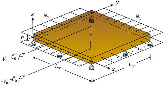 Based on the CCST framework, we develop a unified SDSDT suitable for analyzing the free vibration characteristics of an FG-MEE microplate under fully simply supported conditions and subjected to magneto-electro-thermo-mechanical loads, as shown in Figure 1. The microplate of interest is subjected to biaxial compressive forces at its edges, electric and magnetic potentials on its top and bottom surfaces, and a uniform temperature change. In the following sections, we derive a strong form of the unified SDPT using Hamilton’s principle. The material properties are assumed to follow either a power-law distribution of the constituent materials’ volume fractions along the thickness direction or an exponential function along the thickness direction.