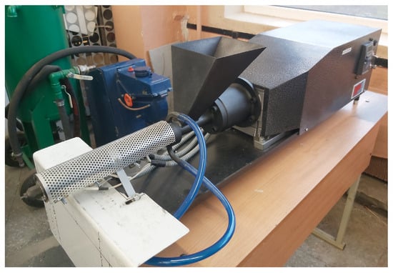 As the object of research, we used composite compositions based on a binder, which is a mixture of polyolefins of the composition “high-pressure polyethylene (HPPE) + polypropylene (PP)” produced by JSC “Belvtorpolymer” (Grodno, Belarus) in the ratio of components 1:3. The specified ratio of the binder was chosen taking into account the high strain–strength characteristics (σv no less than 35 MPa) and low melt viscosity (PTR = 18 ± 1 g/10 min) of PP, as well as the need to increase the frost resistance and impact toughness of PP by modifying it with LDPE additives (σv no less than 22 MPa; PTR = 2.6 ± 0.3 g/10 min; Charpy impact toughness—not destroyed), ensuring the resistance of the composite to dynamic loads [16]. The components were mixed in a single-screw extruder Z-7M (ITC-Pro, Shchyolkovo, Russia) with a constant pitch of turns, with a screw diameter of 25 mm, a material cylinder length of 400 mm, a compression ratio of 1.8 and a power consumption of 2.8 kW (Figure 1).