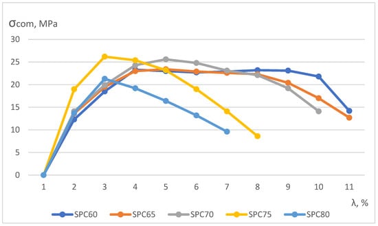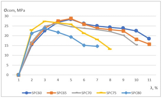 The deformation–strength dependencies under the uniaxial compression of SPC samples filled within 60–80 wt% with quartz filler coated with stearic acid are shown in Figure 4.