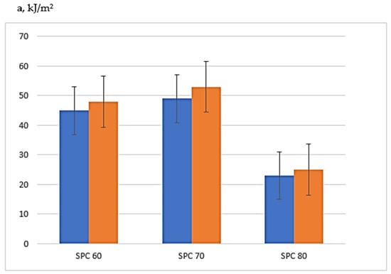 In all samples (SPC 60, SPC 70, and SPC 80), the impact toughness is higher for the samples with modified sand (red bars) compared to the samples with original sand. It can also be seen that the more silica sand in the SPC, the lower the impact strength. The modification of silica sand leads to an improvement in the ability of the SPC to absorb energy during impact. This improvement, although small, is stable and is observed at different concentrations of silica filler. The silica sand content is inversely proportional to the impact toughness.