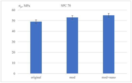 The finishing of quartz filler particles not only ensures the good adhesion of the filler surface to the polymer binder but also helps to reduce the interaction between filler particles and prevents their agglomeration, which causes a decrease in the physical, mechanical and technological characteristics of the resulting composites. It is known that highly dispersed particles of cluster-structured materials with a developed surface (high specific surface area) exhibit high modifying capacity in the composition of thermoplastic polymer matrices due to the charge state [37,38]. First of all, the strengthening of the polymer matrix occurs due to the formation of supramolecular formations in the amorphous phase of the polymer structure. This fact suggests that the modification of the polymer binder with highly dispersed particles exhibiting a charge state will improve the deformation and strength characteristics of the SPC. For this purpose, silicon dioxide was introduced into the composition of SPC75. This is a white powder with an average particle size of 5 nm (trade name “Aerosil-380” (Evonik, Germany) and a specific surface area of 380 m2/g, possessing excellent adsorption properties. The choice of the SPC70 composition is due to the acceptable level of deformation and strength characteristics of the composite. The silicon dioxide content was 0.1 wt% of the content of the thermoplastic matrix of the mixed composition. The test results are shown in Figure 6.
