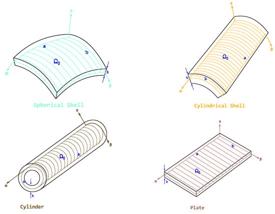 In the present section, a coupled model for the 3D magneto-elastic problem regarding spherical shells is proposed. In the first two subsections, the three 3D equilibrium equations and the 3D divergence equation for magnetic induction are presented for spherical shell panels as a set of four second-order differential equations governing the 3D coupled magneto-elastic problem. These equations are written specifically for FGPM structures in an orthogonal reference system having two curved in-plane coordinates and a rectilinear transverse normal coordinate. This reference system degenerates from that for spherical shells to that for plates with easy consideration of the radii of curvature and . In Figure 1, all possible geometries are clearly indicated with the related reference middle surface and curvilinear-rectilinear orthogonal reference system and . This set of equations has four basic variables: the three displacements u, v and w and the magnetic potential . In the last subsection, the resolution method involving harmonic forms and the exponential matrix method is described. Thanks to the proposed mathematical formulation, FGPM smart structures can be investigated for static and free frequency problems.