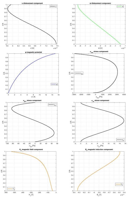 The solution methodology for the three-dimensional magneto-elastic problem for FGPM structures can be performed when geometrical relations (Equation (1)) and constitutive equations (Equation (2)) are introduced in the 3D governing equations (Equation (4)). In this way, the three-dimensional magneto-elastic problem is proposed in terms of the basic variables and .