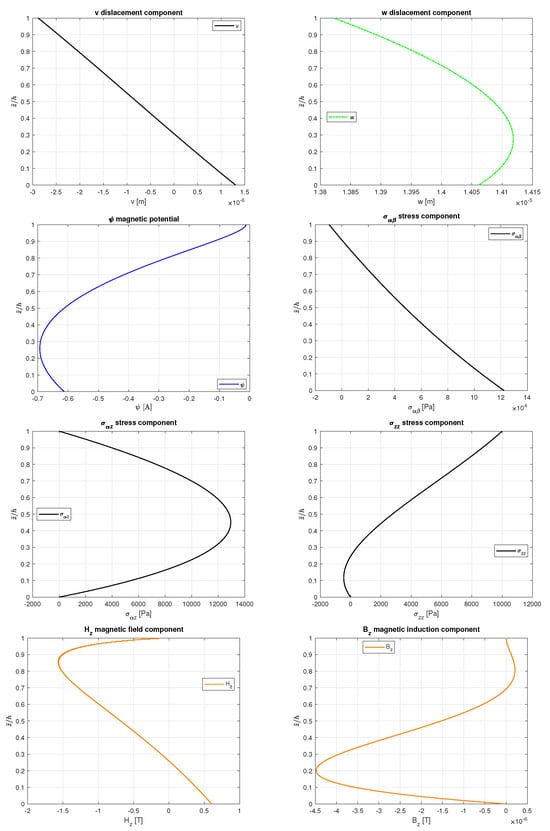In the second benchmark (B2), a static analysis of a cylindrical shell made of FGPM is presented. The sensor configuration considers a transverse normal mechanical load imposed on the external surfaces ( Pa and Pa). The magnetic potential is not imposed as zero at external surfaces but it is free. The material configuration is the same as that proposed in the B1 case (bottom constituent is and top constituent is ). Both the mechanical and magnetic material properties are given in Table 1 and data for the geometry, half-wave number coupled and load conditions for boundaries are summarized in Table 8. Mechanical and magnetic FGPM laws are the same as those presented for the B1 case (see also Equation (21)). Table 10 shows the tabular results for different p values and different thickness ratios at specific locations for the following variables: v, w, , , , , and . The same variables as those in Table 10 are shown for and for in Figure 3. The trends in Figure 3 are typical of FGM structures as mechanical and magnetic properties continuously vary in the thickness direction according to the laws in Equation (21). Differently from multilayered structures, no changes in slope and/or discontinuities are present. So, it can be stated that interlaminar continuity conditions are correctly imposed. In addition, elasto-magnetic coupling and effects connected with the thickness of the layer are perfectly depicted. Load boundary conditions are satisfied considering the values at the top and at the bottom of the structure. No impositions at the outer surfaces on the magnetic potential profile are used, as can be seen from the trend along the thickness direction in Figure 3.