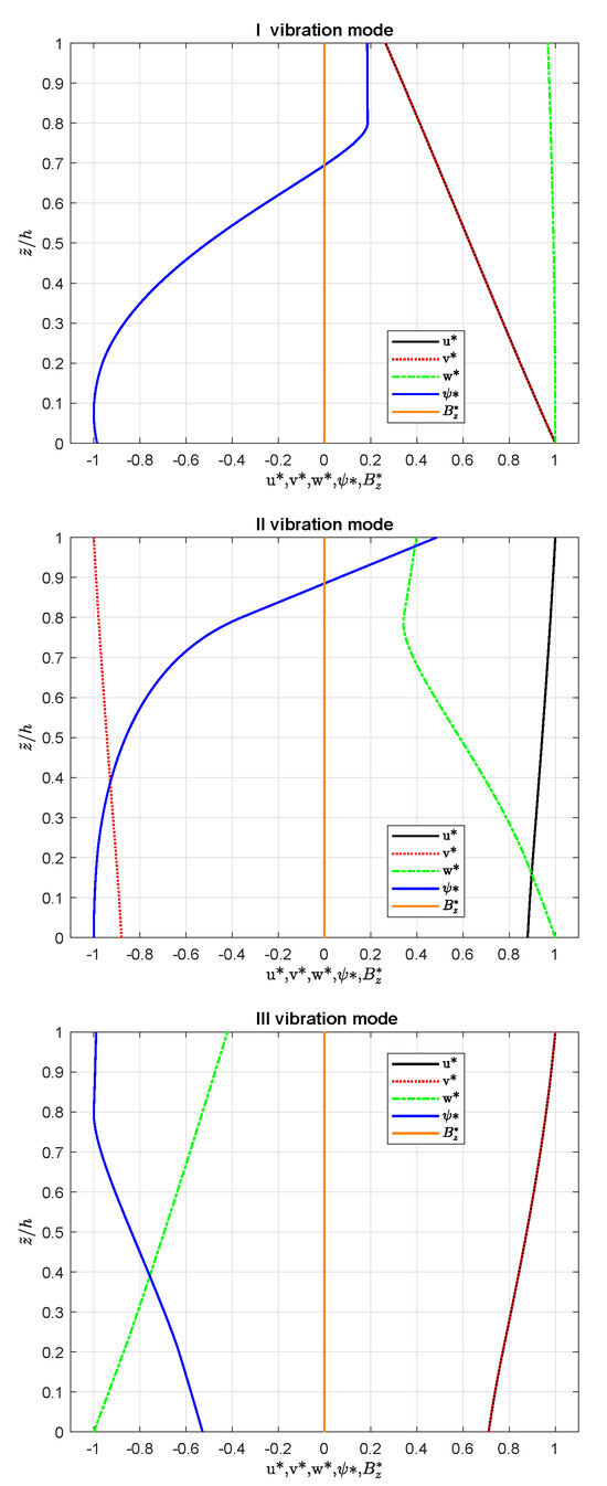 where and . The mechanical and magnetic properties of the two constituents are written explicitly in Table 1 under the and columns. The data for geometry are reported in Table 8 under the B3 column. In Table 11, the first three circular frequency values for different half-wave number couples and different thickness ratios are given by considering as an exponential term. It is possible to notice that the curvature effect of the configuration is clearly marked because the circular frequency related to the I mode decreases from thick to thin thickness ratios. In Figure 4, the thickness modes related to the first three vibration modes for half-wave numbers, and , are shown in terms of normalized values , , , and . The normalization is performed by dividing u, v, w, and by their own maximum values. From Figure 4, the correct imposition of the open-circuit conditions is clear in the trend, together with the thickness layer effect and the correct impositions of conditions for the interlaminar continuity.