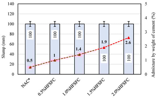 - A slump of 100 mm was successfully attained in the mixes NAC*, 0.5% HFSFC, 1.0% HFSFC, 1.5% HFSFC, and 2.0% HFSFC, achieved by adding 0.5%, 1%, 1.4%, 1.9%, and 2.6% admixture by weight of cement, respectively.