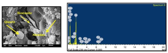 Figure 3 shows the SEM image of the modified M-Sand. The images reveal that M-Sand frequently contains traces of other minerals in addition to lime, silica, and alumina. Well-defined dense gray and brighter calcite crystal grains and scattered flat and elongated gypsum crystals and grains of inequitable particle sizes are separated, resulting in several voids. Uniform distributions of platy and layered frameworks with partially dense CaSO4 and amorphous silica are visible on the other side, and the porosity is interlinked. In comparison, particles adhere to the surfaces with many voids, even though the white/gray particle accumulations indicate the presence of alumina, quartz, and bentonite, as well as calcite or dolomite or both, at a magnification of 10,000×, as depicted in Figure 3.