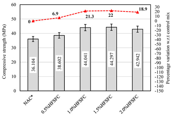 The 28-day concrete strength is a standard reference for evaluating compressive strength by any standard code of practice. This study measured compressive strength at 28 days of curing, as shown in Figure 5. The compressive strength of the control mix NAC* and the newly prepared concrete mixes of 0.5%HFSFC, 1.0%HFSFC, 1.5%HFSFC, and 2.0%HFSFC was found to be 36.104, 38.602, 44.041, 44.297, and 42.942 MPa, respectively. The results of the mixes 0.5%HFSFC, 1.0%HFSFC, 1.5%HFSFC, and 2.0%HFSFC meet the requirement of (f’cr) (38 MPa), as per references [39,40]. The control mix designated as NAC* had a compressive strength of 36.104 MPa, which was close to the selected target strength (f’cr) of 38 MPa. The result shows that the hair fiber–silica fume concrete combinations perform well and achieve the (f’cr) at 28 days of curing. All mixes of 0.5%HFSFC, 1.0%HFSFC, 1.5%HFSFC, and 2.0%HFSFC fulfilled all standard criteria for this study at 28 days of curing [39,40]. At 28 days of curing, the control mix NAC* fulfilled the field and design strength criteria but failed to reach the (f’cr) of 38 MPa.