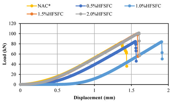 The load–displacement results from each mix, i.e., NAC*, 0.5%HFSFC, 1.0%HFSFC, 1.5%HFSFC, and 2.0%HFSFC, are shown in Figure 6. The maximum peak load (P) was used to compute the STS of mixes NAC*, 0.5%HFSFC, 1.0%HFSFC, 1.5%HFSFC, and 2.0%HFSFC. At the peak load, hair fiber–silica fume concrete combinations performed well and were not broken into two pieces. As and when the sample reached the peak load, sudden failure in the sample was observed. Plain concrete is sensitive and does not exhibit the elastic behavior required to hold the samples, which is the main reason for the splitting of the cylindrical samples into two halves when the load peaked. In this study, hair fiber–silica fume concrete combinations at the maximum peak load exhibited some ductile behavior, as shown in Figure 6. It is observed in Figure 6 that the lowest peak load was found in the mix NAC* without silica fume and hair fibers.