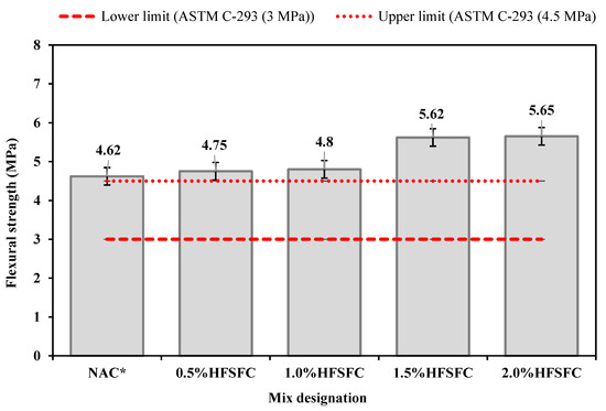 Since it is challenging to test concrete directly for tensile strength, indirect tests are employed. Splitting tensile strength (STS) and flexural strength (FS) are commonly used indirect methods. This study used the STS method to assess the indirect tensile strength of concrete. This study evaluated the STS of mixes designated as 0.5%HFSFC, 1.0%HFSFC, 1.5%HFSFC, and 2.0%HFSFC, including the reference mix NAC* (100% OPC). Reference [41] recommends that the average STS value must be between 10% and 15% of (f’c). This study selects the design strength (f’c) of 30 MPa at 28 days of curing. According to the criterion proposed by reference [41], 10–15% of (f’c) retains the value of 3–4.5 MPa. The standard criteria set by reference [41] were used to validate the STS results of this study.