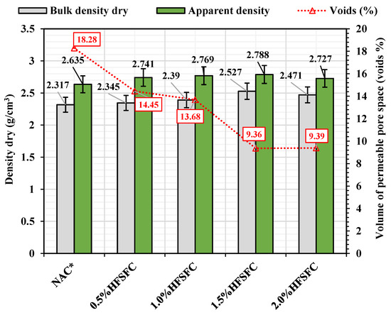 However, the dry bulk density increased with an increase in HF content up to 1.5% with optimized 10% SF. The dry bulk density increased when HF was added (0.5–1.5%) and 10% SF was replaced by OPC. When the HF percentage was increased to 2%, the bulk density slightly declined compared to 1.5% HF. Another factor that results in the formation of a more compact and less porous structure is the particle size of SF, which is smaller than that of OPC, thus increasing the density. It is evident from the results that the percentage increase in dry bulk density is smaller in the reference mix NAC* without HF + SF compared to the mixes with HF + SF. This indicates that SF in the samples filled the pores, and thus, the samples absorbed less water than those without SF. Thus, the newly developed concrete mixes of 0.5%HFSFC, 1.0%HFSFC, 1.5%HFSFC, and 2.0%HFSFC with HF + SF showed better density, and the required density threshold was achieved for the 1.5% HF with the optimized 10% SF combination.