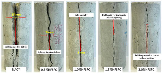 The reference mix NAC* with 100% OPC was found to be sensitive and did not show any elastic behavior for holding the samples. This is the main reason for the splitting of the cylindrical samples into two halves, as shown in Figure 9. The cracking patterns of the cylindrical samples with SF + HF incorporation in the mixes 0.5%HFSFC, 1.0%HFSFC, 1.5%HFSFC, and 2.0%HFSFC are shown in Figure 9. In the mixes 1.0%HFSFC, 1.5%HFSFC, and 2.0%HFSFC, samples were not broken into two halves. The quality of cement paste was improved by adding optimized 10% SF to the mixes 1.0%HFSFC, 1.5%HFSFC, and 2.0%HFSFC.