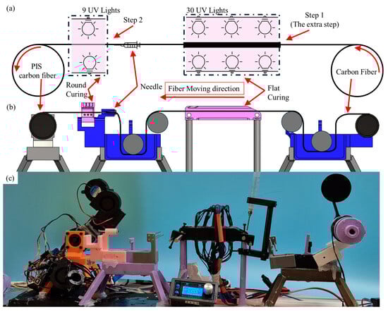 (a) Schematic, (b) CAD design, and (c) machine setup of the pre-impregnation process to prepreg continuous fibers with photo-sensitive resin.