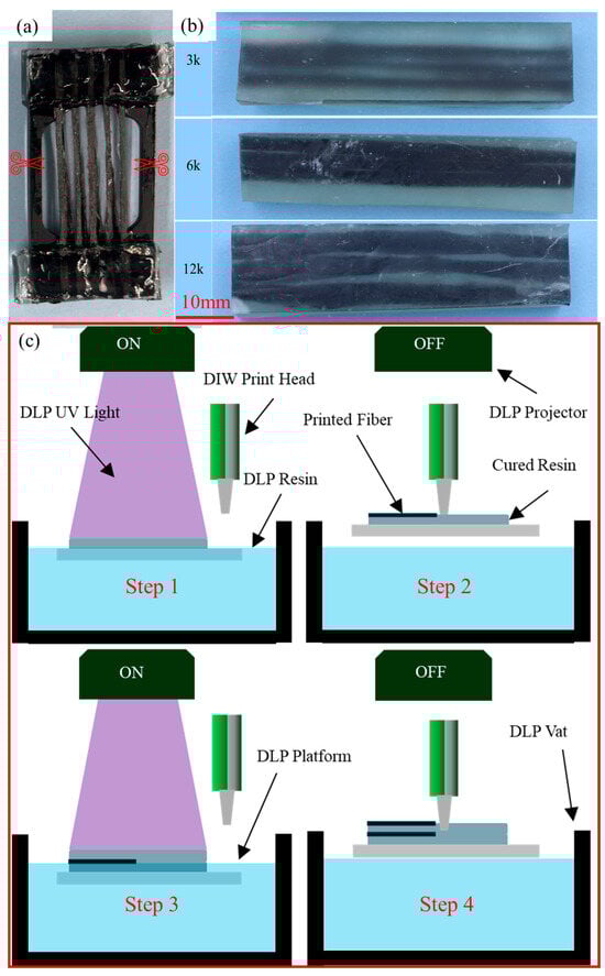 (a) Samples made for PIS-treated fiber tensile test, (b) DIW-DLP printed CCFRPCs with PIS-treated fiber for tensile and bending tests (3K, 6K, 12K from top to bottom), and (c) DIW-DLP 3D printing process.