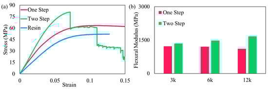 (a) The bending test results comparison of one and two-step(s) PIS process on 12K fiber bundles. (b) Flexural Modulus of 3, 6, and 12K bundles with one- and two-step(s) PIS process.