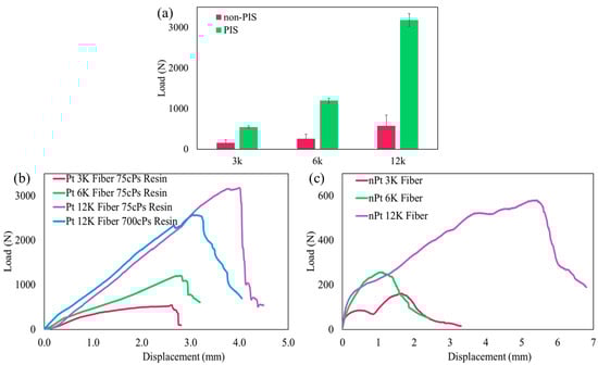 The peak load values for non-PIS-treated and PIS-treated fiber bundles are shown in Figure 4a. For all fiber sizes, PIS-treated samples exhibited significantly higher peak loads than their non-PIS-treated counterparts. Specifically, the 3K, 6K, and 12K PIS-treated samples achieved peak loads of approximately 655.7 N, 1297.3 N, and 3158.9 N, respectively. These values increased significantly with the application of PIS, highlighting the role of pre-impregnation in enhancing fiber–fiber bundle bonding. The trend also indicates that thicker bundles, while naturally able to carry greater loads due to their higher fiber content, benefit more substantially from the PIS process.