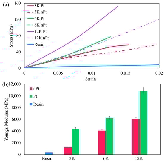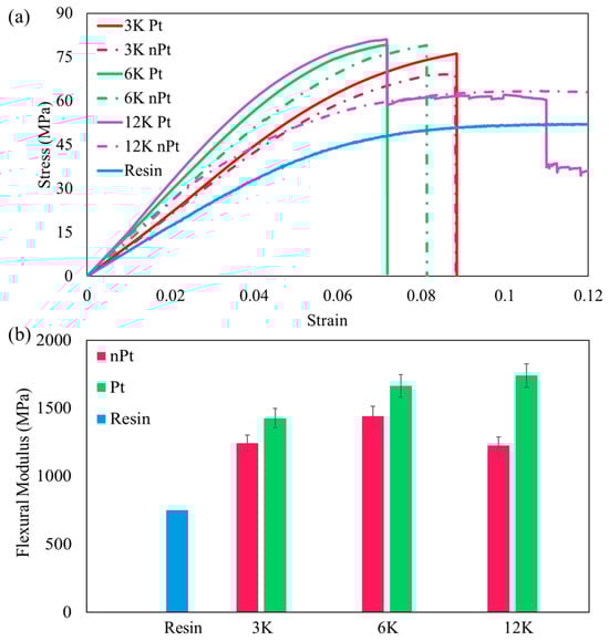 (a) The strain-stress curve of bending test of fiber samples made by 3, 6, and 12K (non-)PIS-treated fiber. (b) The bar chart of flexural modulus of 3, 6, and 12K (non-)PIS-treated fiber (Pt refers to PIS-treated, and nPt refers to non-PIS-treated in the figures).