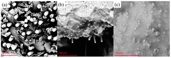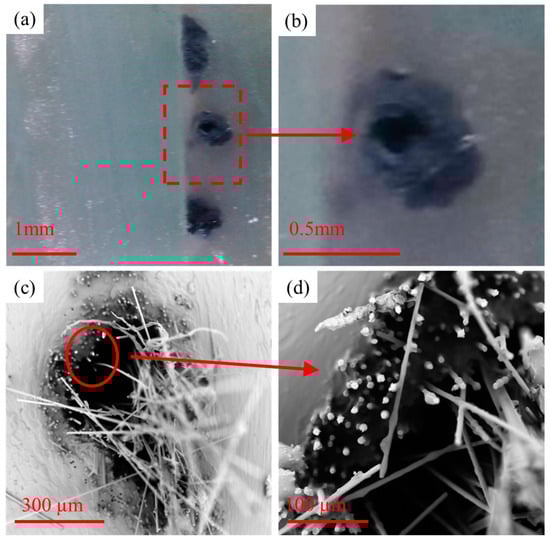 This pull-out behavior is symptomatic of weak fiber-matrix adhesion, which compromises load transfer efficiency and contributes to premature failure under stress. In contrast to the PIS-treated counterparts, which demonstrate more cohesive failure modes and cleaner fracture surfaces, the non-PIS-treated samples reveal a heterogeneous failure profile marked by fiber debonding and matrix separation. The enlarged view in Figure 10d clearly illustrates the distinction between the clean break surfaces of fully cured fibers and the smeared or ragged regions surrounding the pulled-out fibers.