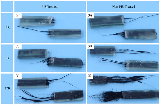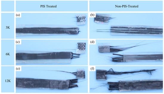 The tensile failure samples: (a) 3K PIS-treated fiber, (b) 3K non-PIS-treated fiber, (c) 6K PIS-treated fiber, (d) 6K non-PIS-treated fiber, (e) 12K PIS-treated fiber, and (f) 12K non-PIS-treated fiber.