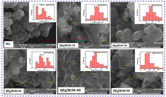 Figure 1 displays the FESEM images of PPy and PPy/BCM nanocomposites. Pure PPy displayed small grains arranged in the form of cauliflower-like shapes and chain patterns. The images of the nanocomposites exhibited collections of BCM nanoparticles embedded in spherically shaped polymers, distributed non-uniformly. The histogram with particle sizes for PPy and PPy/BCM nanocomposites is presented in Figure 1. ImageJ software was employed to analyze the average particle sizes, which are summarized in Table 1. The polymerization process of PPy at nucleation sites led to a reduction in the particle size of the nanocomposites as compared to pure PPy.