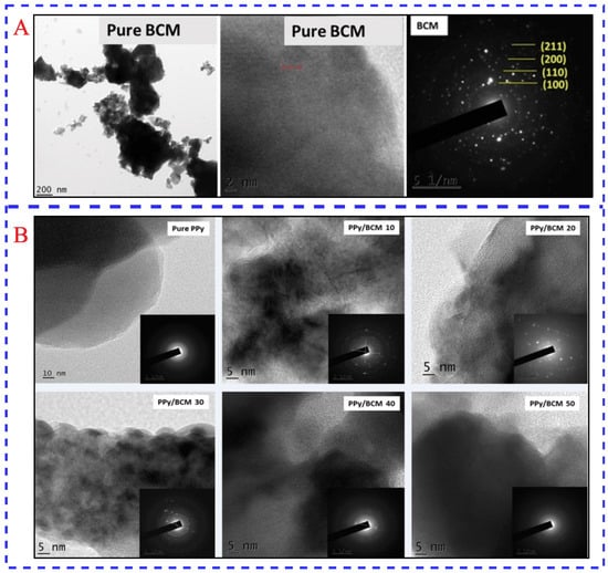 The HRTEM, TEM images, and SAED patterns of pristine BCM nanoparticles are presented in Figure 2A. The BCM nanoparticles were found to have a size range of 35–60 nm with lattice fringes spaced at 0.25 nm. The SAED patterns exhibited bright spots, indicating a crystalline structure. Figure 2B shows the HRTEM images and SAED patterns (inset) of PPy and PPy/BCM nanocomposites. The PPy particles were sphere shaped, with a size of 500–600 nm. The SAED patterns for pure PPy displayed a spherical shape with an incessant ring network because of the presence of a benzene ring in the polypyrrole, indicating an amorphous nature without any diffraction spots. The BCM nanoparticles were uniformly distributed and connected to pyrrole due to the in-situ polymerization technique used for synthesis. The SAED pattern revealed a semi-crystalline structure of the PPy/BCM nanocomposites. All nanocomposites comprised clustered BCM nanoparticles within PPy. However, with an increase in BCM concentration from 10 to 50 wt.%, PPy/BCM underwent different structural modifications as shown in frame B.