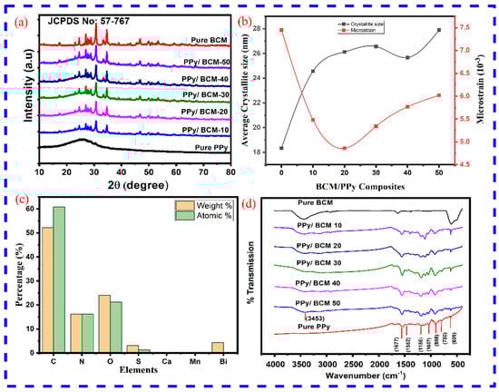(a) XRD pattern for PPy, PPy/BCM nanocomposites, and BCM nanoparticles; (b) Scherrer average crystallite size and W–H microstrain variation with BCM content; (c) elemental composition values; (d) FTIR spectra for PPy, PPy/BCM nanocomposites, and BCM nanoparticles.