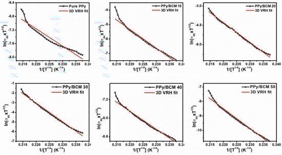 This fitting affirms that three-dimensional Mott VRH is the dominant conduction mechanism in PPy and PPy/BCM. After validating the 3D VRH conduction model in this temperature range from room temperature to 180 °C, the graphs of ln (σdc × T1/2) versus (1/T1/4) were plotted and fitted with straight lines, as shown in Figure 4.