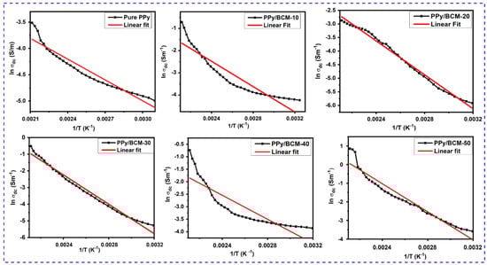 where A is the pre-exponential factor. The Arrhenius or activated type of conduction was observed for both pure PPy and PPy/BCM nanocomposites, and linearly fitted Arrhenius plots were obtained, as shown in Figure 5. To obtain these plots, ln(σ) was plotted against 1/T, where σ is the DC conductivity and T is the temperature in Kelvin. The slope of the plot is –Ea/Rg, where R is the Rydberg constant (Rg = 8.3145 J/K mol).