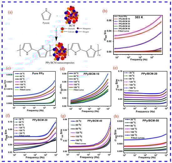 (a) PPy/BCM nanocomposite synthesis step; (b) the variation in total conductivity as a function of frequency with nonlinear fitted curves for PPy and PPy/BCM nanocomposites at 303 K; (c–h) temperature-dependent AC conductivity (σac) versus frequency plot for PPy and PPy/BCM nanocomposites with non-linear curve fitting.
