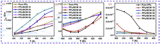 (a–c) Temperature-dependence of DC conductivity (σdc), the exponent (s), and the pre-factor (A) for PPy and PPy/BCM nanocomposites.