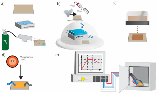 Figure 1b shows details about the substrate washing and wiping as part of the pre-processing step. Figure 1c shows the printing or fabrication step for the Au film. Figure 1d shows the post-processing step to sinter the sample, and Figure 1e shows the experimental setup used to characterize the electrical behavior of the thin film at the different environmental conditions typically used in the qualification of equipment for applications in avionics.