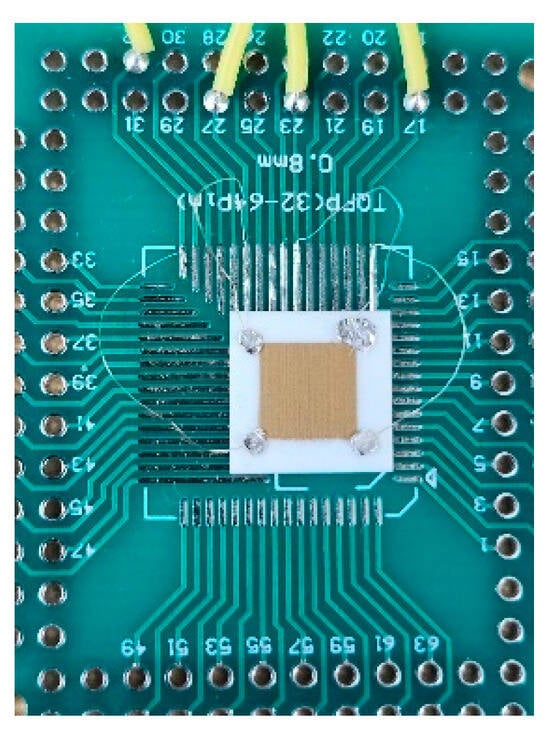 The integration between thin films and conventional circuits is challenging, given that soldering methods can deteriorate the region of the film where the solder is applied. Therefore, the integration between the data acquisition equipment and the printed device was accomplished by mounting the alumina substrate on an industrial prototype board. One side of a silver metal wire (0.003″ diameter, from A-M Systems, Inc., Washington, DC, USA) was soldered to conductor traces on the board. The other side of the wire was connected to the film using an Indium metal paste (99.99% purity, from Indium Corporation, New York, NY, USA). The Indium paste was applied on the film, covering the silver wire, at room conditions.