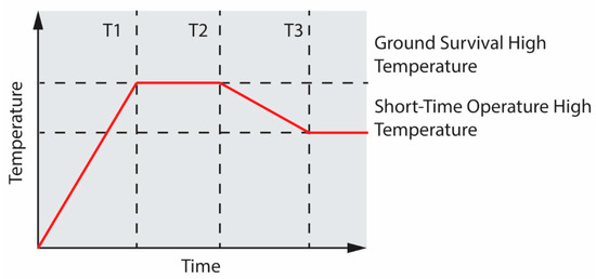 Figure 5 shows the temperature setpoint and step times required for the Ground Survival High Temperature and Short Temperature Test. The temperature gradient from T 0 to T 1 is not specified. Once the temperature stabilizes in the environmental chamber, the device is tested for at least 3 h. From T 2 to T 3 , the minimum temperature rate of change is specified to 2 m i n . The time from T 3 to T 4 is set to at least 30 min for equipment stabilization, and the test time from T 4 to T 5 is 30 min or more.