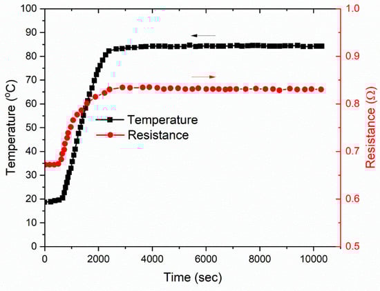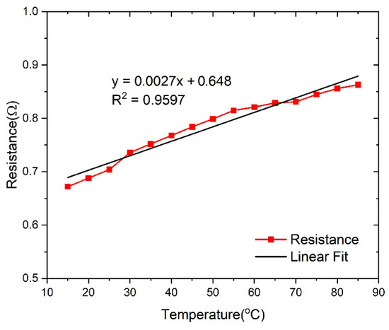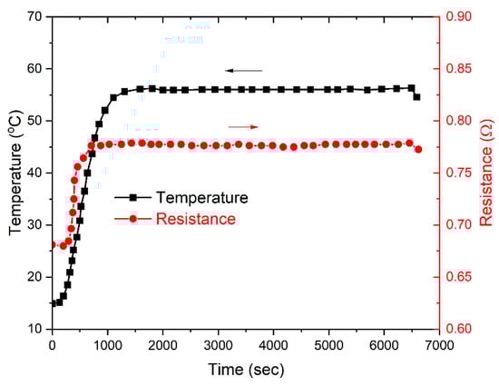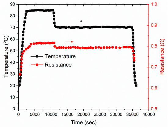 Figure 6 shows the results obtained for the Operating at High Temperature Test. The total length of the test was 1.8 h. The figure shows that at 15   ° C , the measured resistance was 0.67   Ω . When the temperature reached the high temperature point at 55   ° C , the measured resistance was 0.78   Ω .