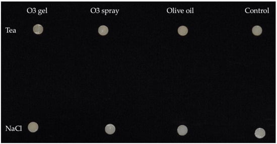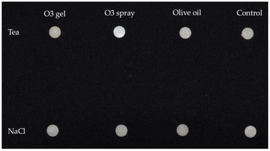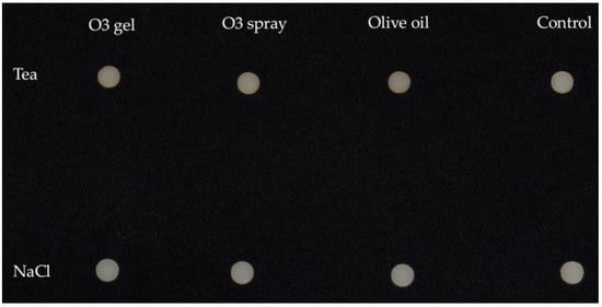 Each treatment was performed on 5 specimens from Group Tea and 5 specimens from Group NaCl. This study was designed to assess the effect of the complete gel (Gelio3) compared to the spray form (without hydrated silica) and to oil (without ozone and hydrated silica). The application was conducted considering a standard quantity of application of periodontal gels in the oral environment. In Figure 3, specimens after the bleaching procedures are shown.