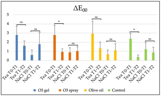 During the T0–T1 period (Table 3), significant differences in terms of color change (ΔE00) between the Tea and NaCl groups were found (p < 0.05), except for Tea Control vs. NaCl groups (p > 0.05). The highest ΔE00 values were found in the Tea Olive Oil and Tea O3 groups, denoting a staining effect of the tea solution. On the other hand, NaCl groups exhibited lower ΔE00 values, demonstrating that the physiological solution did not contribute significantly to staining. No significant intragroup differences occurred (p > 0.05).