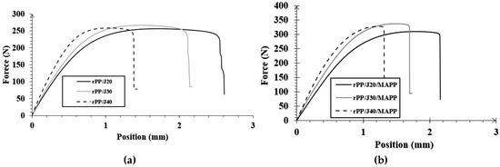 The tensile test results, presented as the average of five replicates for each composite, provide insights into the mechanical behavior of the materials. Key parameters, including Young’s modulus, tensile strength, and elongation at break point, are detailed in Table 2, and the force-displacements are provided in Figure 1 for the composites, with and without compatibilizer MAPP.